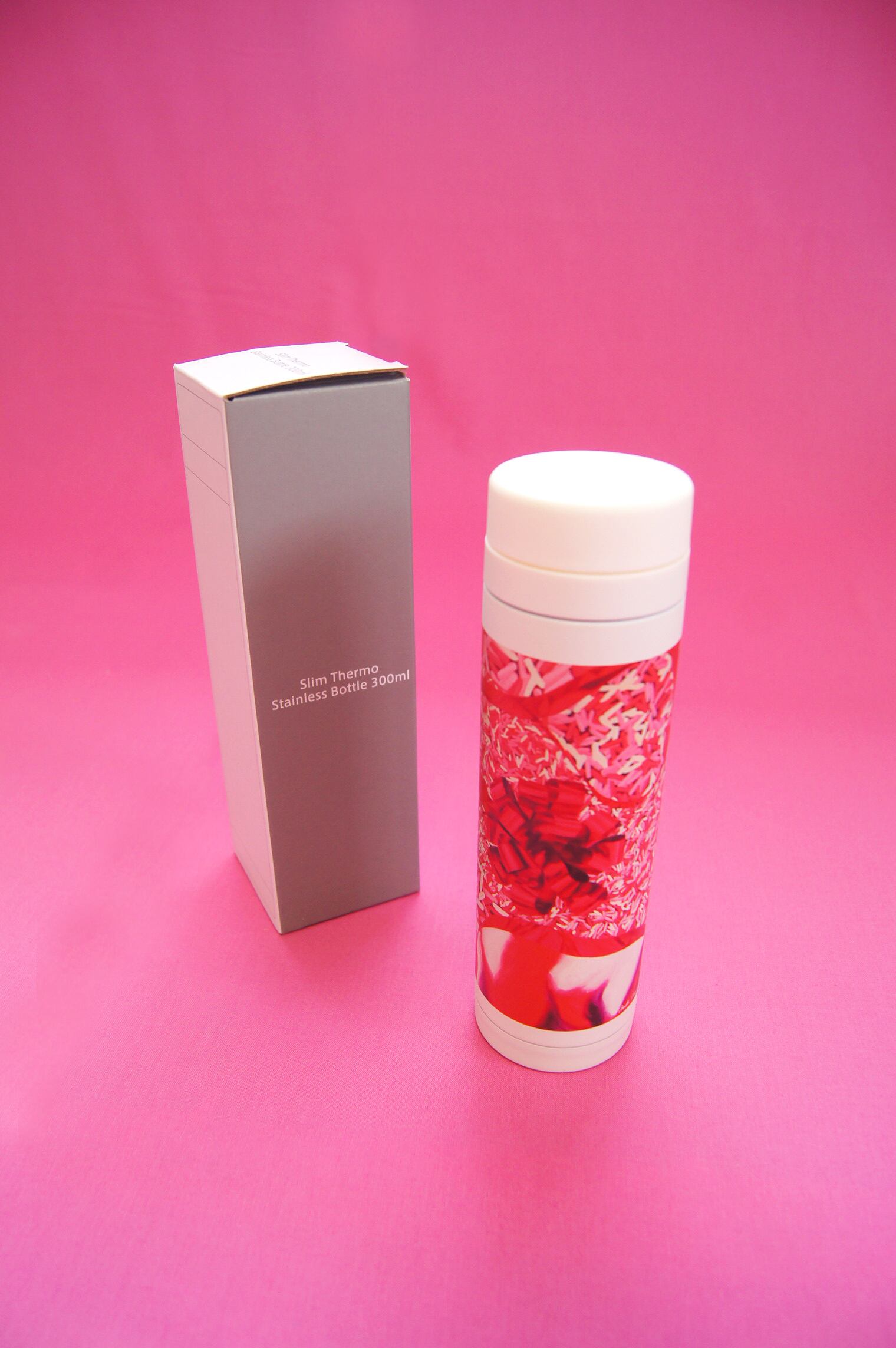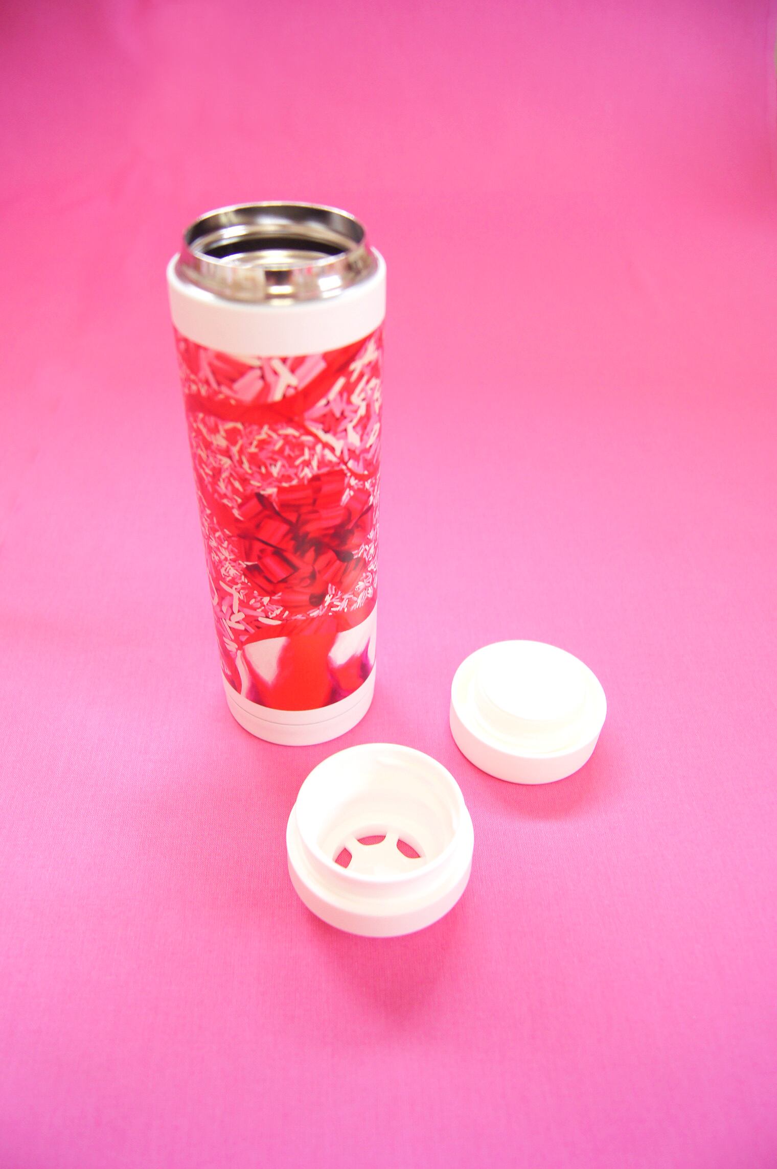 油彩作品"Chocolate Spinkles GIFT - Pink Party"がプリントされた保冷保温ボトルです。